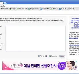 Python 썸네일형 리스트형 온라인 컴파일 사이트 codepad 말 그대로 온라인상에서 컴파일을 해볼 수 있는 사이트.. http://codepad.org/ 이러한 형태로 되어있고.. 속에 코드를 넣고 섭밋을 누르면 출력이 아래와 같은 화면으로 나온다. 작성시 임의의 주소가 할당되어 다른이에게도 코드와 출력내용을 알려줄 수 있어서[구글 주소 줄여주기 기능과 비슷한 느낌] 컴공과 대학생들이 과제 문제에 대해 알려준다거나 하는 용도로 사용이 가능할 듯... 무려 C C++ D Haskell Lua OCaml PHP Perl Plain Text Python Ruby Scheme Tcl 을 지원.. 아래는 임의의 코드를 넣고 돌려본 결과물. 이런식으로 나오게 된다. 더보기 이전 1 다음